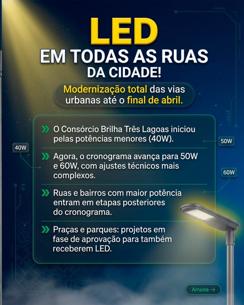 Atualmente, o Consórcio Brilha Três Lagoas está trabalhando para instalar iluminação LED em todas as vias urbanas até o final de abril. Esse processo, no entanto, exige planejamento e dedicação, sendo realizado em diversas etapas. Atualmente, a equipe está focada nas vias de maior potência, que necessitam de ajustes técnicos específicos para garantir a eficiência e a segurança da nova iluminação.