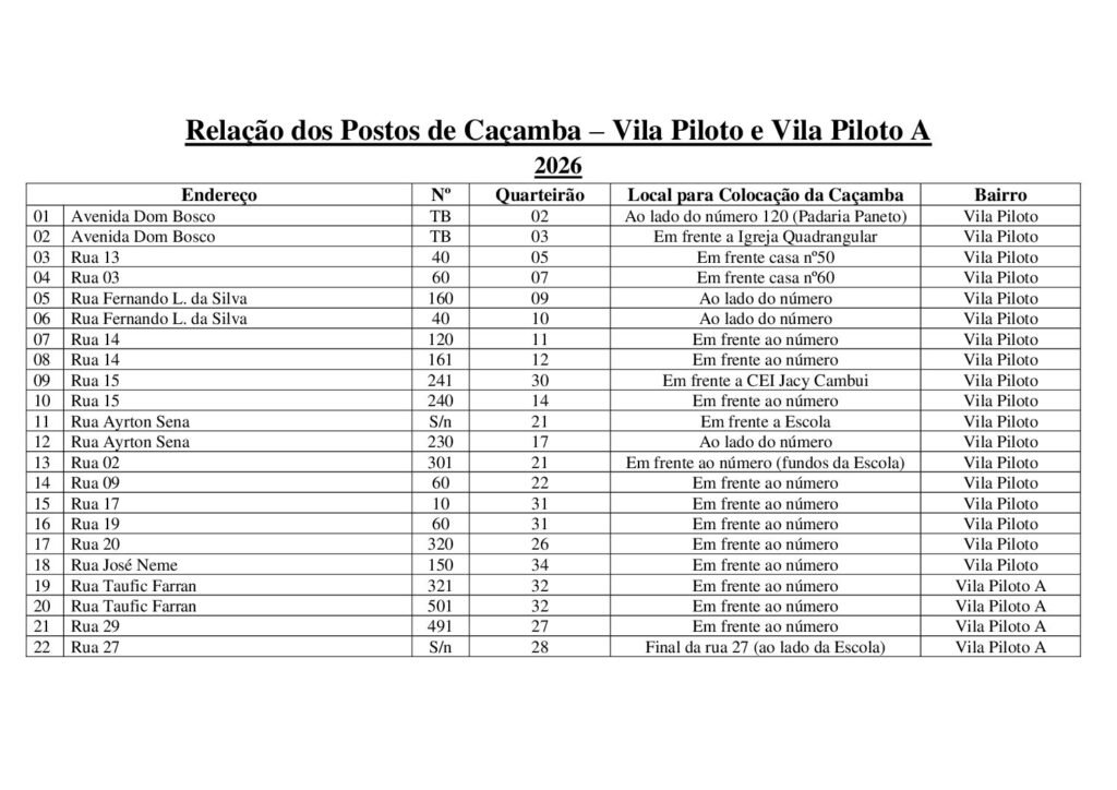 As caçambas estarão localizadas nas seguintes vias, em frente aos números indicados:
