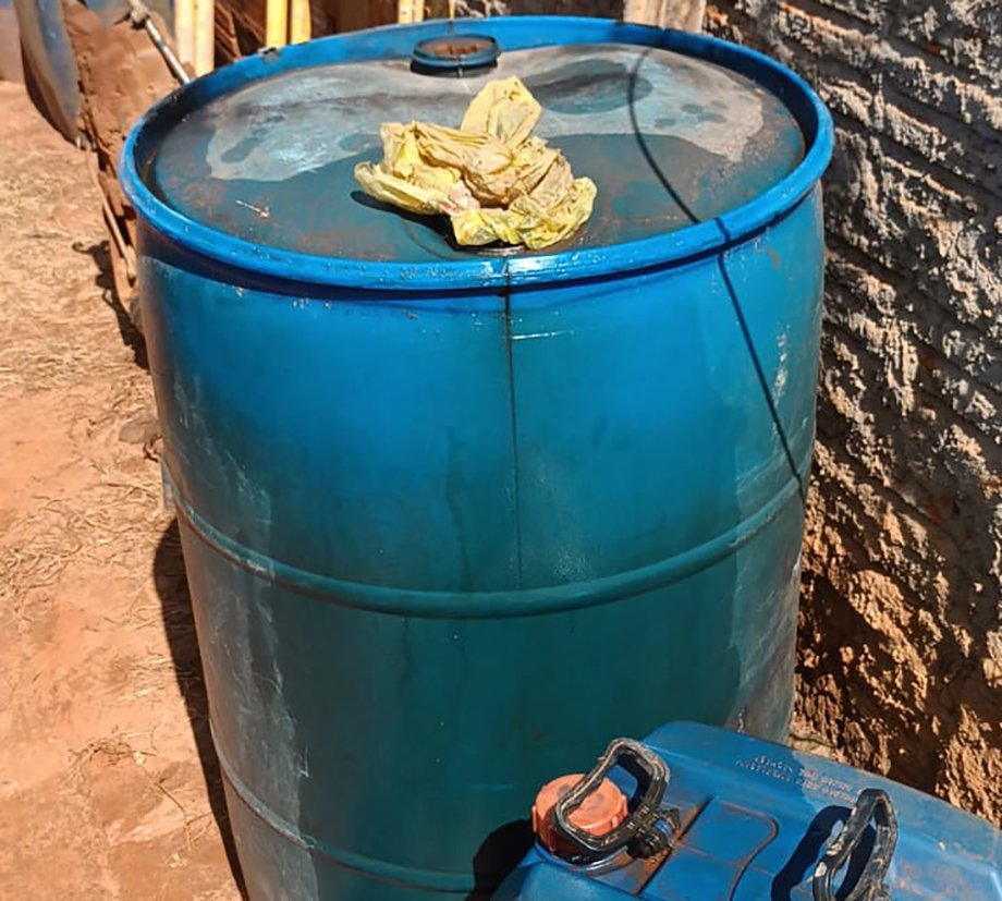 No imóvel houve a localização de galões e tambores com o combustível subtraído, aproximadamente 600 litros, os quais foram apreendidos.