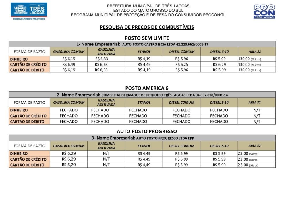A Prefeitura de Três Lagoas, por meio do Programa Municipal de Proteção e Defesa do Consumidor (PROCON/TL), divulgou nesta sexta-feira, 13 de novembro, a pesquisa de preços de combustíveis realizada nos postos da cidade. O levantamento tem como objetivo auxiliar os consumidores a encontrarem os melhores valores e incentivar a concorrência justa no mercado local.